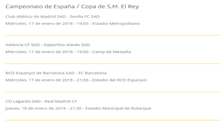 Calendario y resultados de cuartos de final copa del rey.