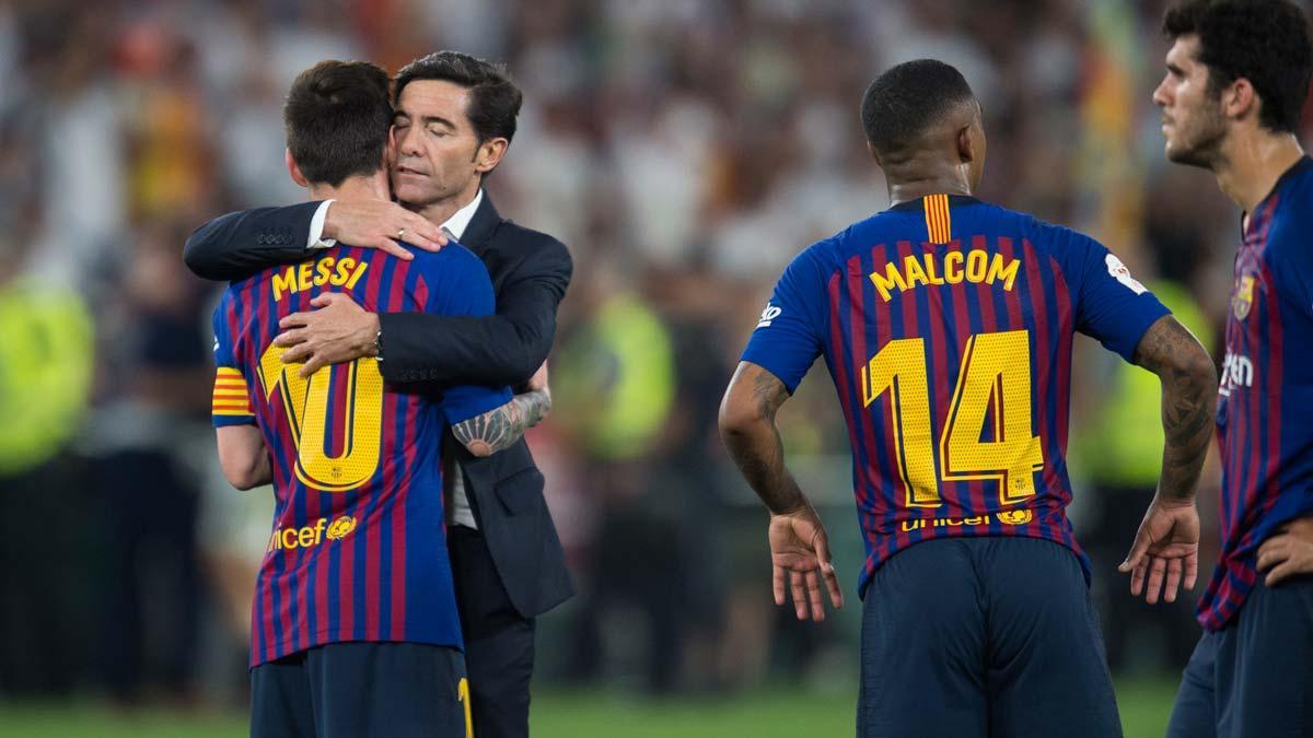 2el entrenador del barcelona, ernesto valverde, consuela a clement lenglet.
